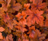 HEUCHERELLA X PUMPKIN SPICE / FOAMY BELLS: Heucherella x 'Pumpkin Spice' is a stunning perennial known for its fiery orange and red foliage with deep copper highlights. This Foamy Bells variety provides a warm, autumn-inspired color palette that deepens as the season progresses, making it an ideal choice for gardens, borders, and containers. Delicate flower spikes with small, creamy-white blooms add a soft, airy touch while attracting pollinators.